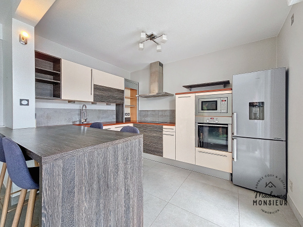 La cuisine semi-ouverte, moderne et entièrement équipée, apporte une touche pratique et esthétique à l'ensemble.