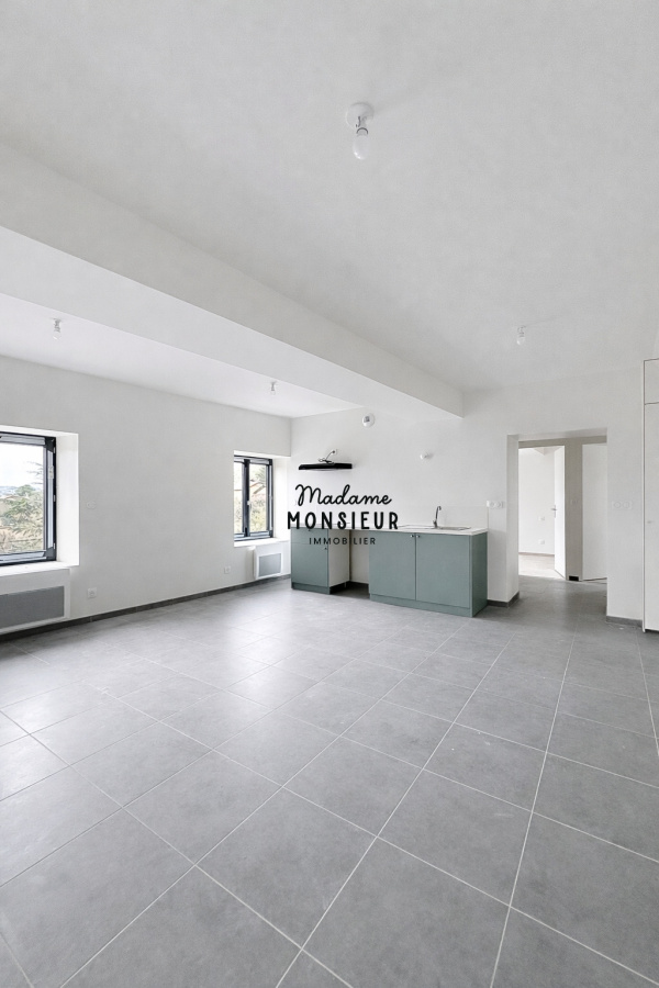 L’entrée dessert, d’un côté, une pièce de vie chaleureuse, idéale pour aménager un espace salon, puis une cuisine semi-ouverte équipée de plaques de cuisson, four et hotte, avec un espace permettant d’installer un coin repas convivial.