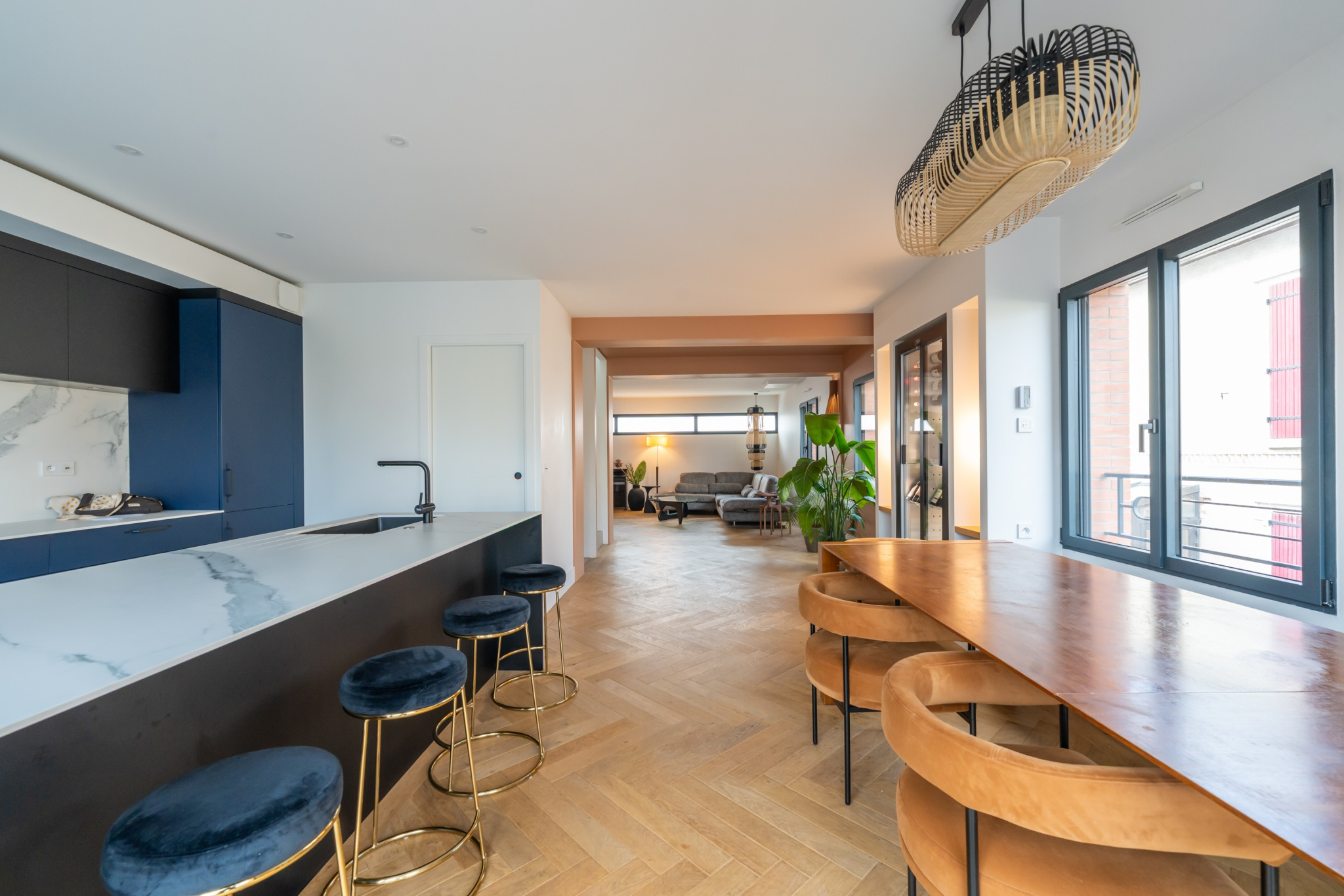 En montant au premier étage, la maison révèle son véritable cœur. Un espace de vie spectaculaire de 62 m², où la lumière circule librement et où les volumes dialoguent avec une architecture épurée.