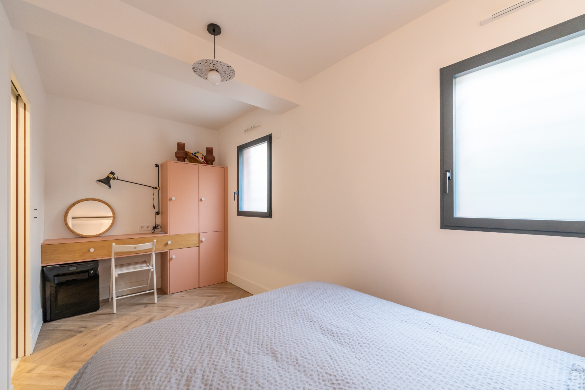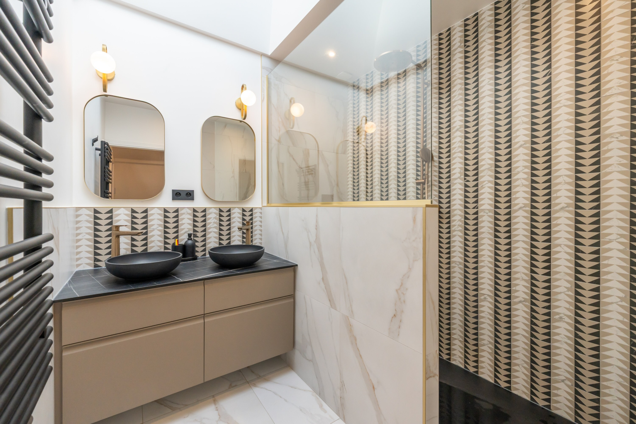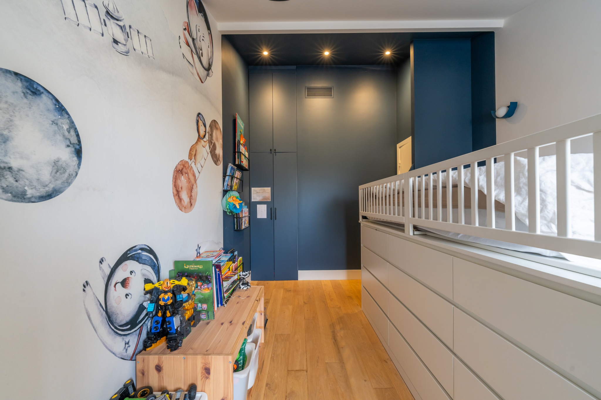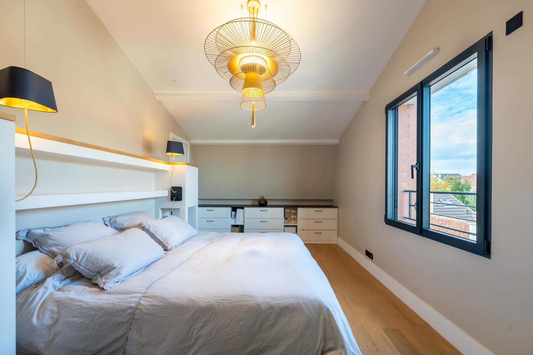 Au dernier niveau, l’espace nuit se fait plus intime. La suite parentale, véritable refuge, propose un dressing entièrement réalisé sur mesure et une salle de douche élégante, où matières et lumière créent une atmosphère apaisante. Deux autres chambres, parfaitement proportionnées, se partagent une salle de bain contemporaine et des toilettes indépendantes.