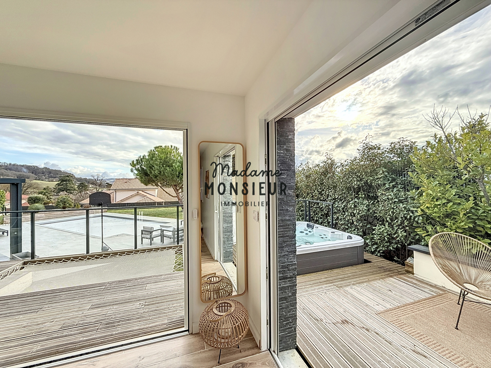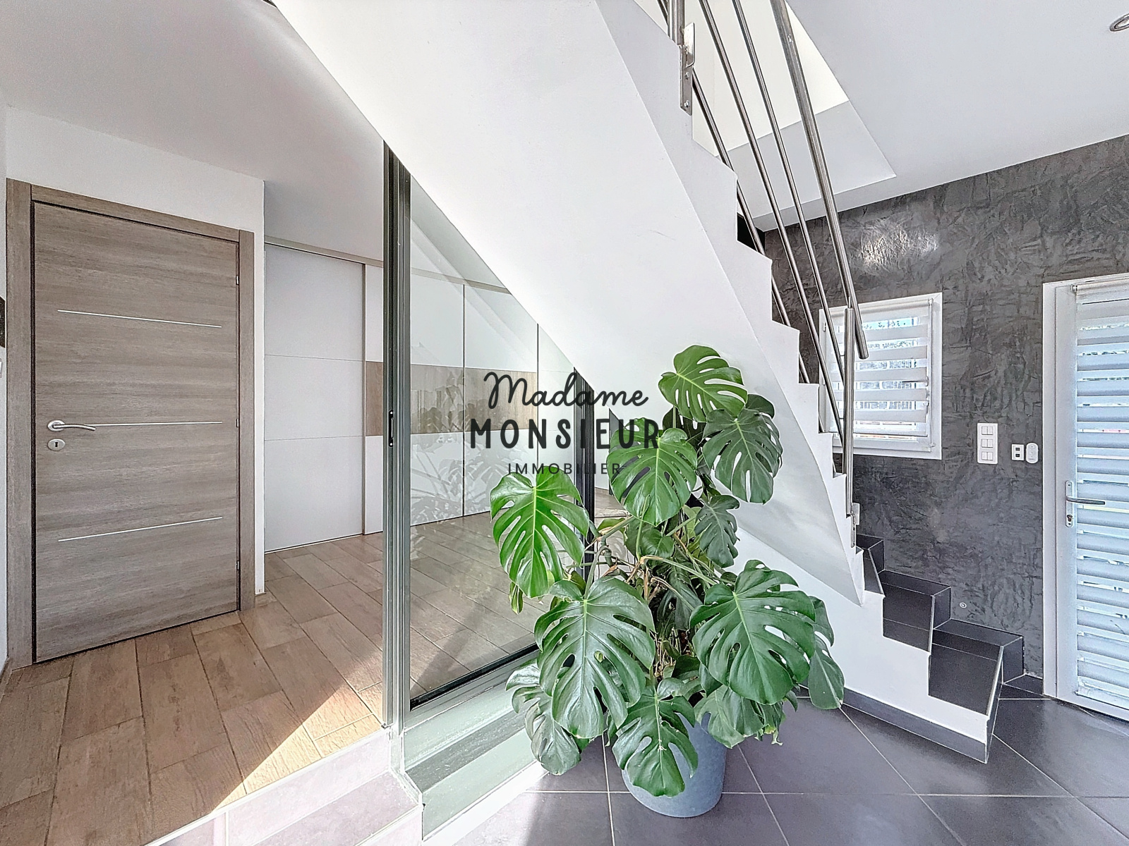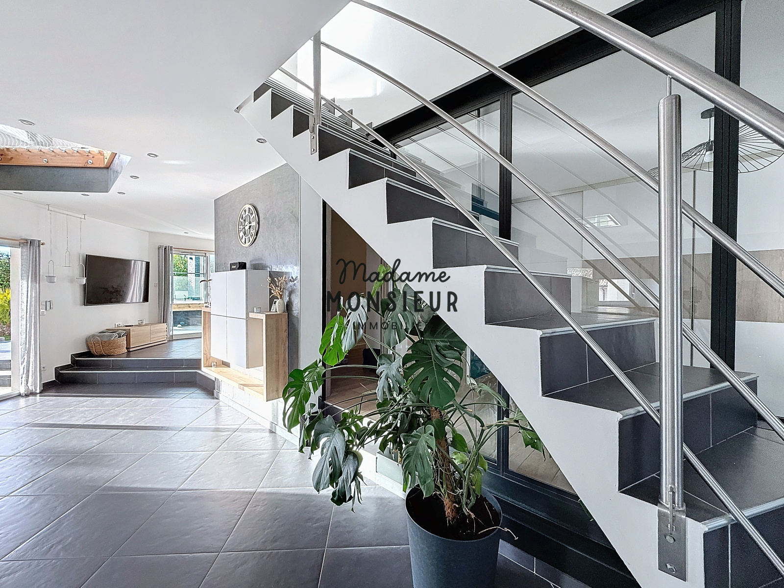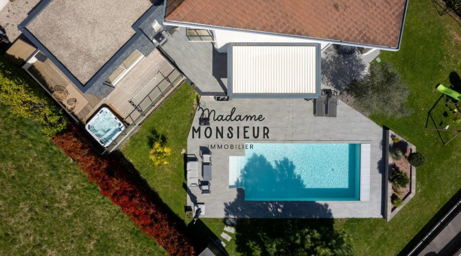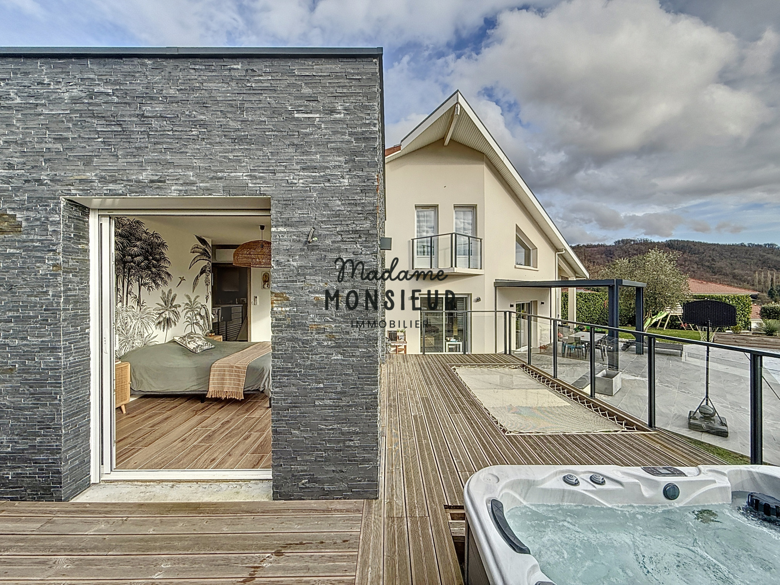 Madame Monsieur Immobilier est fier de vous présenter en exclusivité cette sublime maison d’architecte, située sur les hauteurs de Ruy, dans un cadre paisible et privilégié, offrant une vue dominante! Dès l’entrée, l’espace et la lumière sont au rendez-vous. Un vaste hall doté de nombreux rangements sur mesure mène à une première chambre spacieuse, qui peut aisément faire office de bureau. Son orientation côté Est permet de profiter d’une vue apaisante sur un majestueux olivier. Un peu plus loin, la maison dévoile une superbe suite parentale nichée dans l’extension récente, pensée comme un véritable havre de paix. Son dressing privatif, sa salle d'eau avec wc et sa chambre surplombant le jardin et sa terrasse suspendue avec jacuzzi créent un ensemble à la fois intime et raffiné. Le cœur de la maison bat autour d’une vaste pièce de vie, baignée de lumière grâce à son toit cathédrale et ses larges ouvertures sur l’extérieur exposée Sud. La cuisine, entièrement équipée et aménagée avec des matériaux de grande qualité, s’intègre harmonieusement à cet espace de convivialité, offrant une continuité fluide vers la terrasse et la piscine, idéales pour profiter des beaux jours. Une buanderie ainsi qu’un WC complètent ce niveau, tandis qu’un double garage assure un accès pratique et direct à la maison. À l’étage, le palier, qui peut être aménagé en espace bureau, distribue une salle de bain pensée pour les enfants, équipée d’une baignoire, d’une douche et de WC indépendants. Deux chambres confortables profitent d’un cadre lumineux et apaisant, tandis qu’une seconde suite parentale vient parfaire cet étage avec son grand dressing et sa salle d’eau privative . Au sous-sol une salle de sport complète toutes les prestations de cette merveille! Cette propriété d’exception, édifiée sur une parcelle de plus de 1 000 m², séduit par la qualité de ses prestations, son architecture moderne et la douceur de son environnement. Rare sur le marché, elle s’adresse aux amateurs de confort, de design et de tranquillité. Disponible exclusivement chez Madame Monsieur Immobilier, nous serions ravis de vous accompagner dans sa découverte. Contactez Landry RABATEL au 06 26 86 03 84 pour plus d’informations.