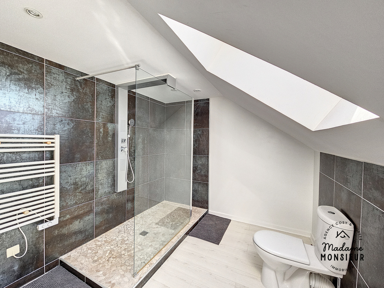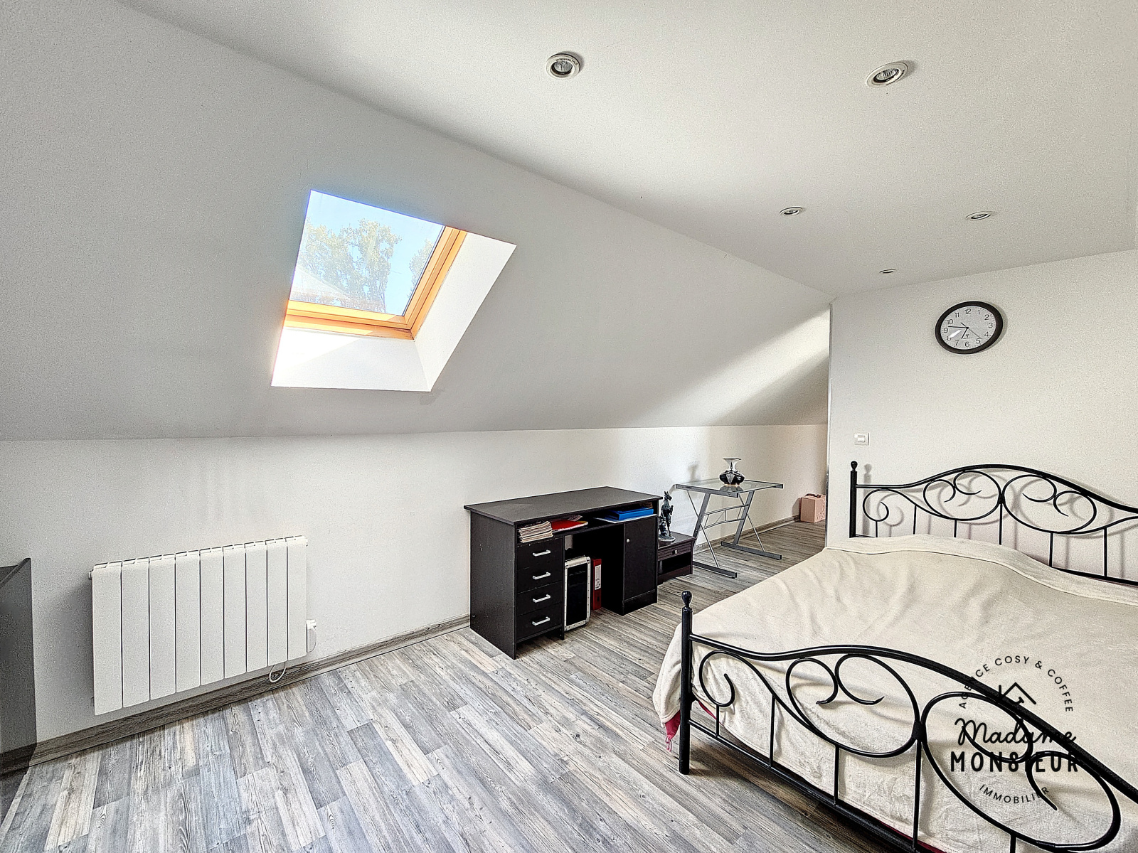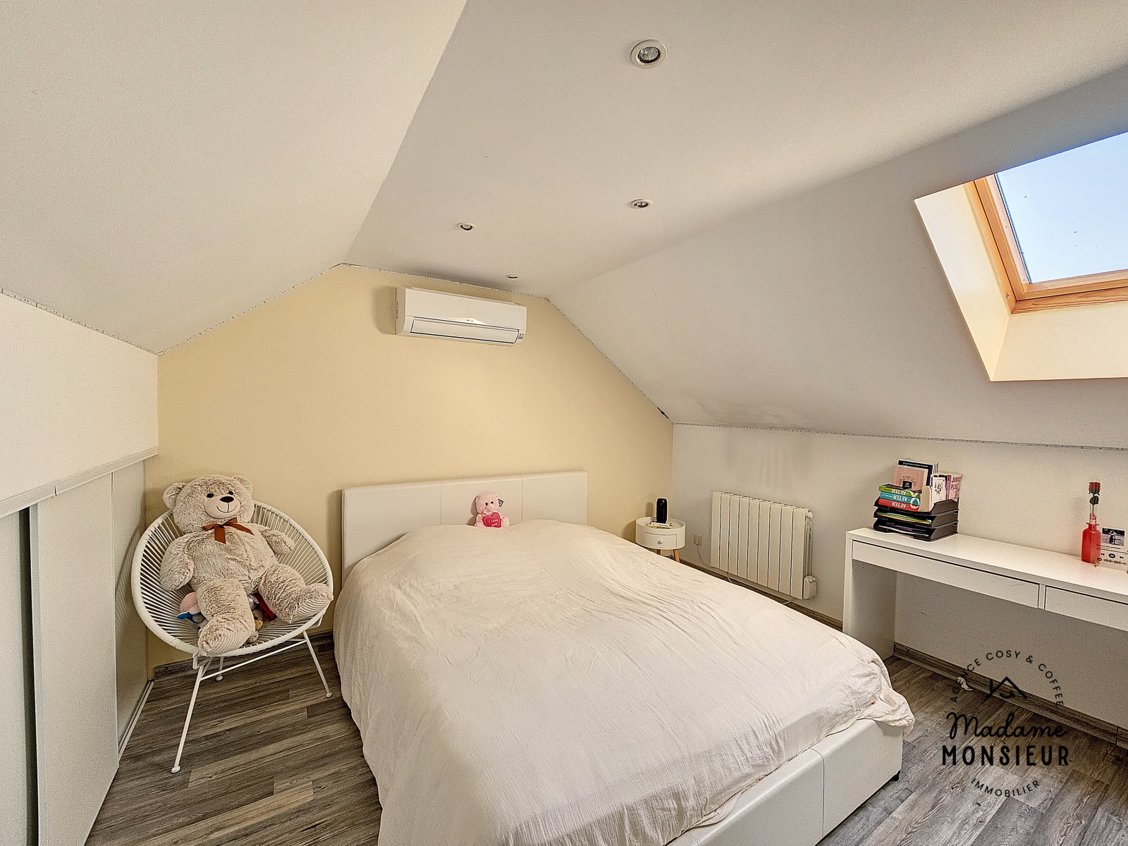A l'étage, vous découvrirez un espace nuit, que vous pourrez dédier à l'usage de votre choix (bureau, atelier,...), une salle d'eau avec douche à l'italienne et WC et pour finir une chambre supplémentaire avec placards et équipée de climatisation.