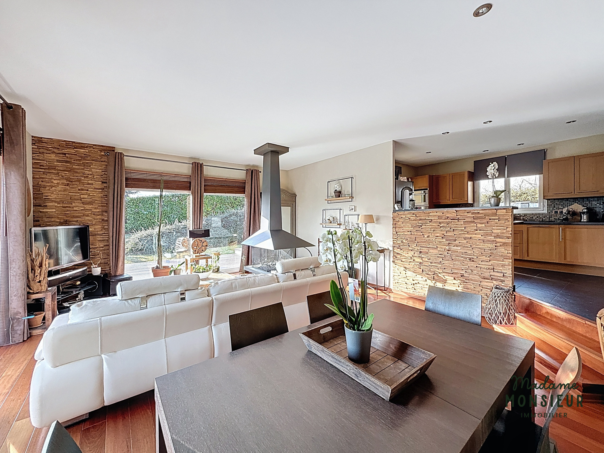 Cette maison lumineuse propose une magnifique pièce de vie offrant une hauteur sous plafond d’environ 3 mètres.