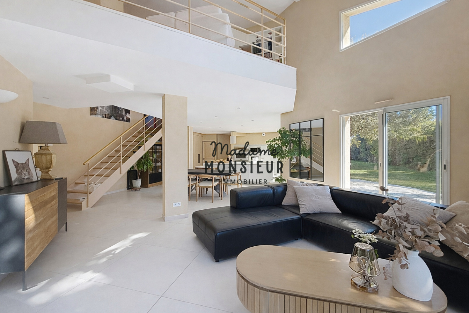 Le cœur de la maison se révèle au rez-de-chaussée, avec un spectaculaire salon-séjour ouvert sur la cuisine. Cet espace de réception, baigné de lumière naturelle grâce aux larges ouvertures sur le jardin, offre une ambiance chaleureuse et élégante, idéale pour recevoir famille et amis. La cuisine, ouverte et conviviale, s’intègre parfaitement à cet espace de vie.