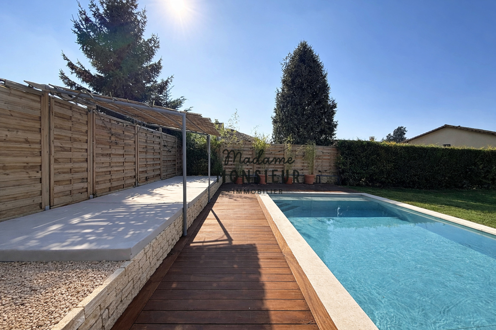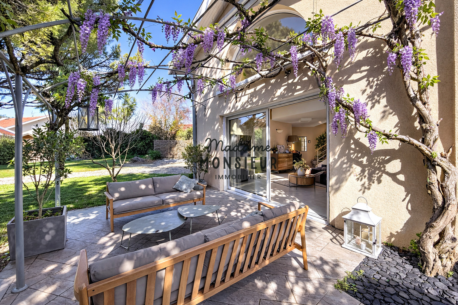 Le jardin, soigneusement entretenu et parfaitement intime, entoure la maison et la piscine dans une ambiance paisible et élégante.