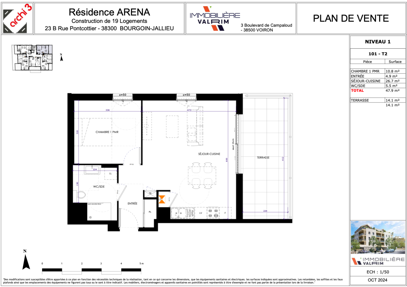 • Type : T2, avec 1 chambre spacieuse et pmr