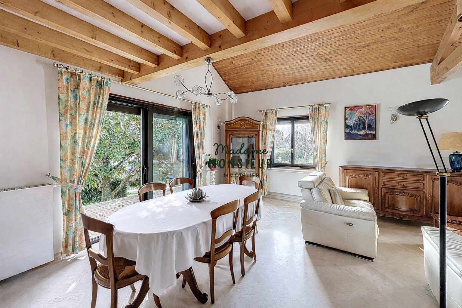 Vous découvrirez ensuite une pièce de vie chaleureuse et très lumineuse, équipée d’une cheminée et de grandes baies vitrées en aluminium donnant directement sur la terrasse et l’espace piscine.