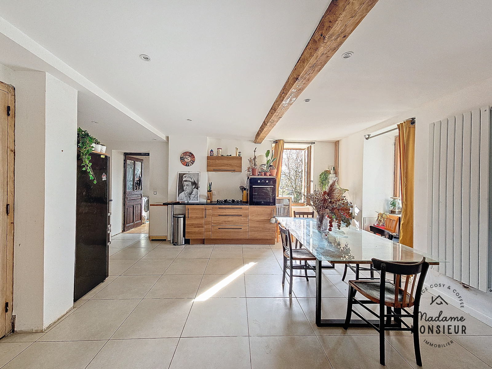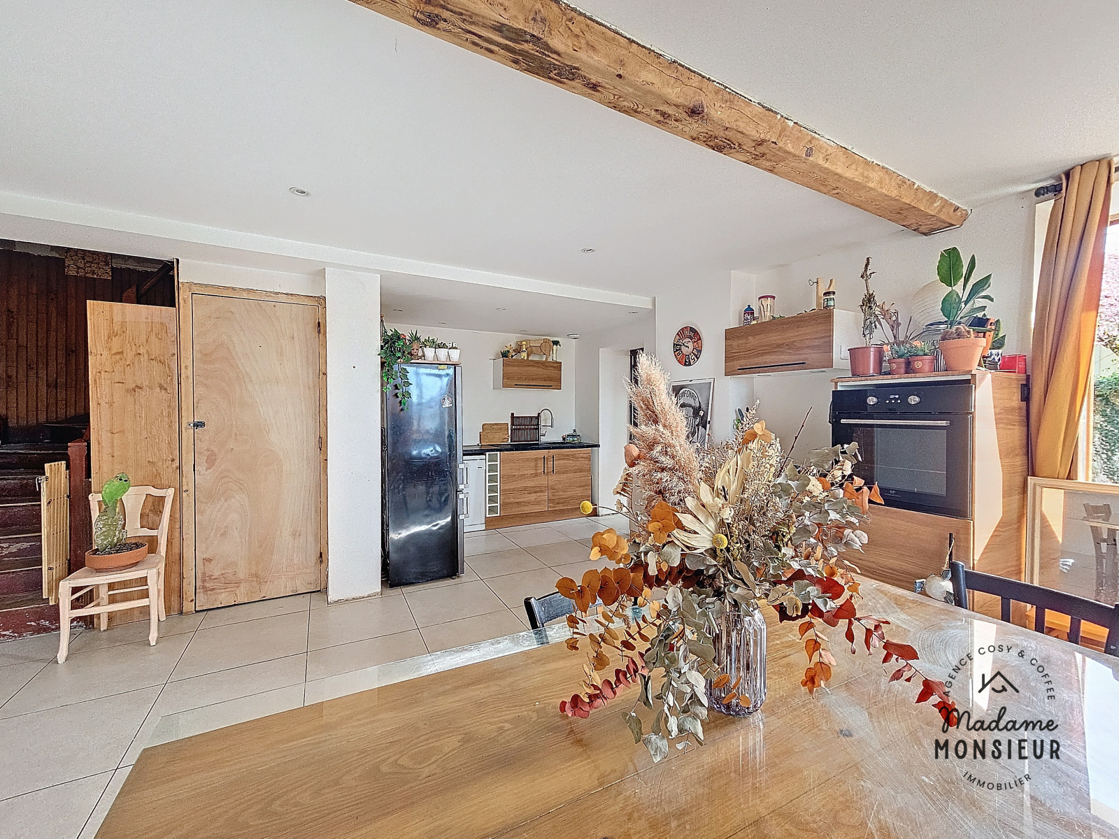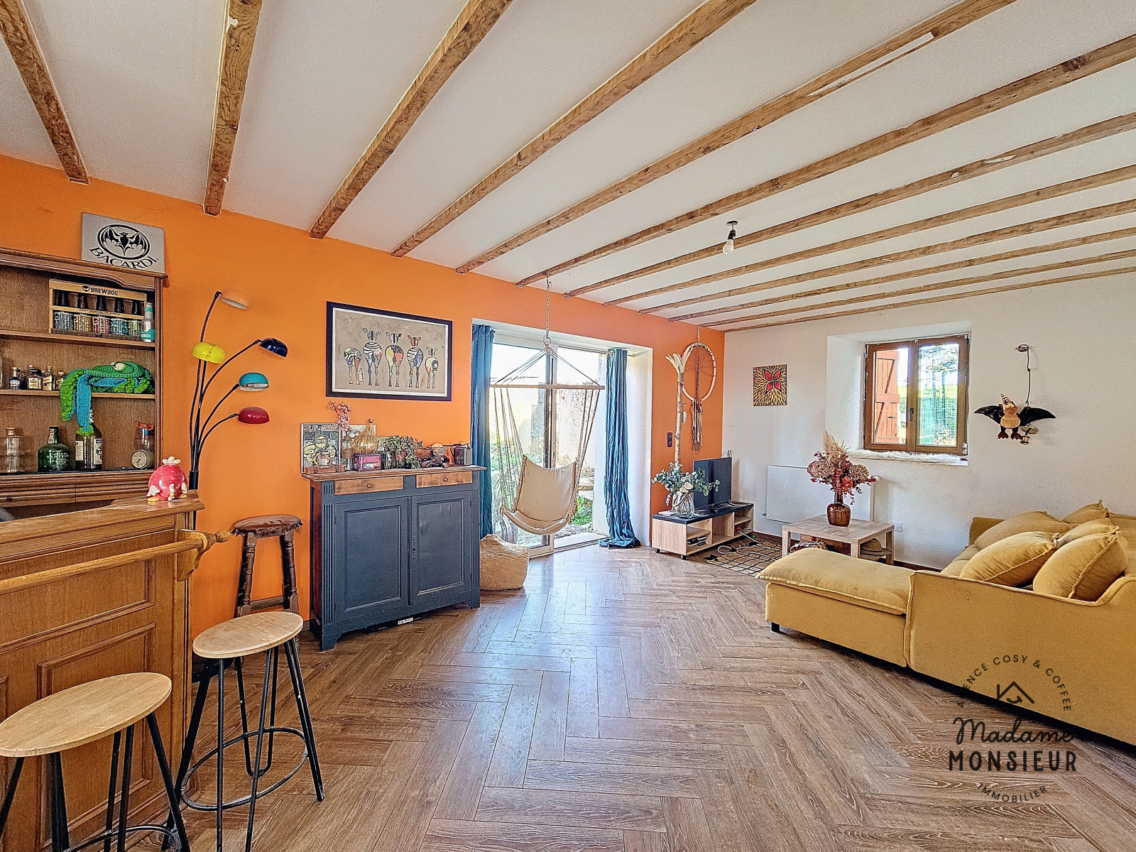 Anaëlle vous propose une maison en partie rénovée comprenant : au rez de chaussée; un séjour ouvert sur la cuisine aménagée et le salon, rassemblant une surface d'environ 50m² chauffé par une pompe à chaleur air/eau.
