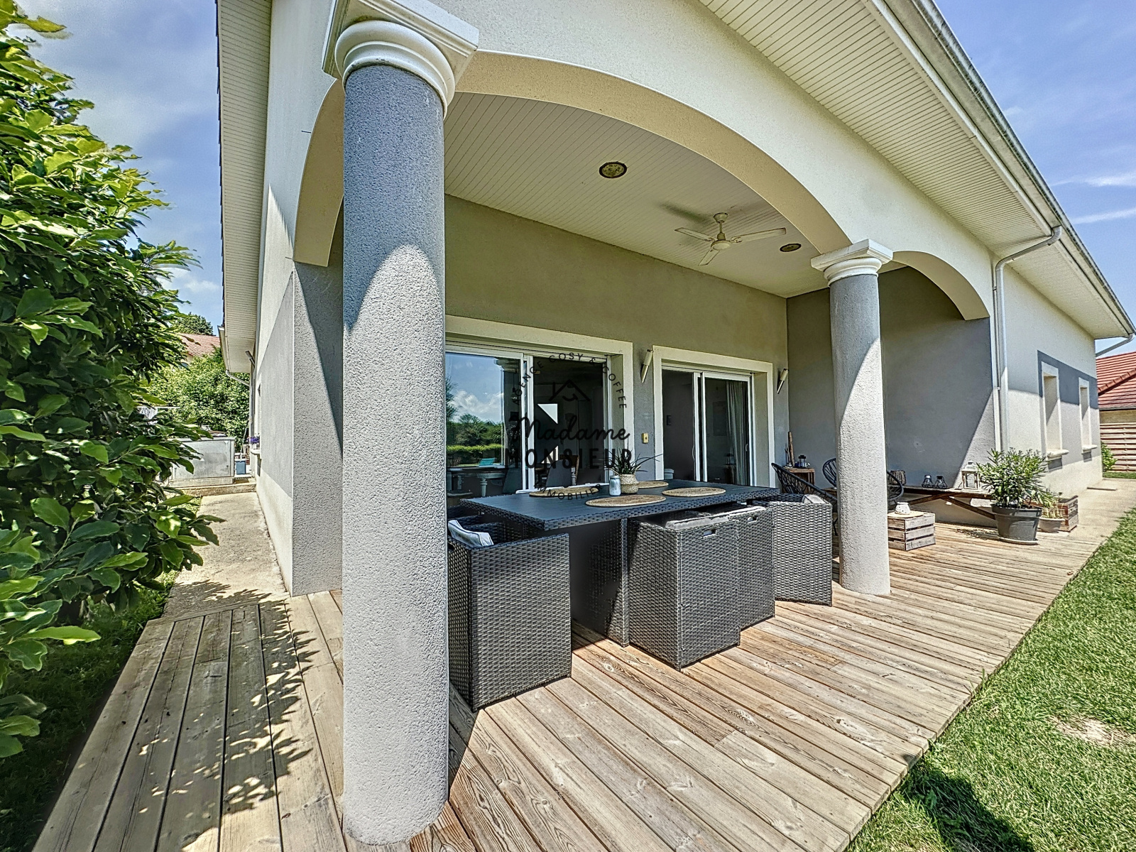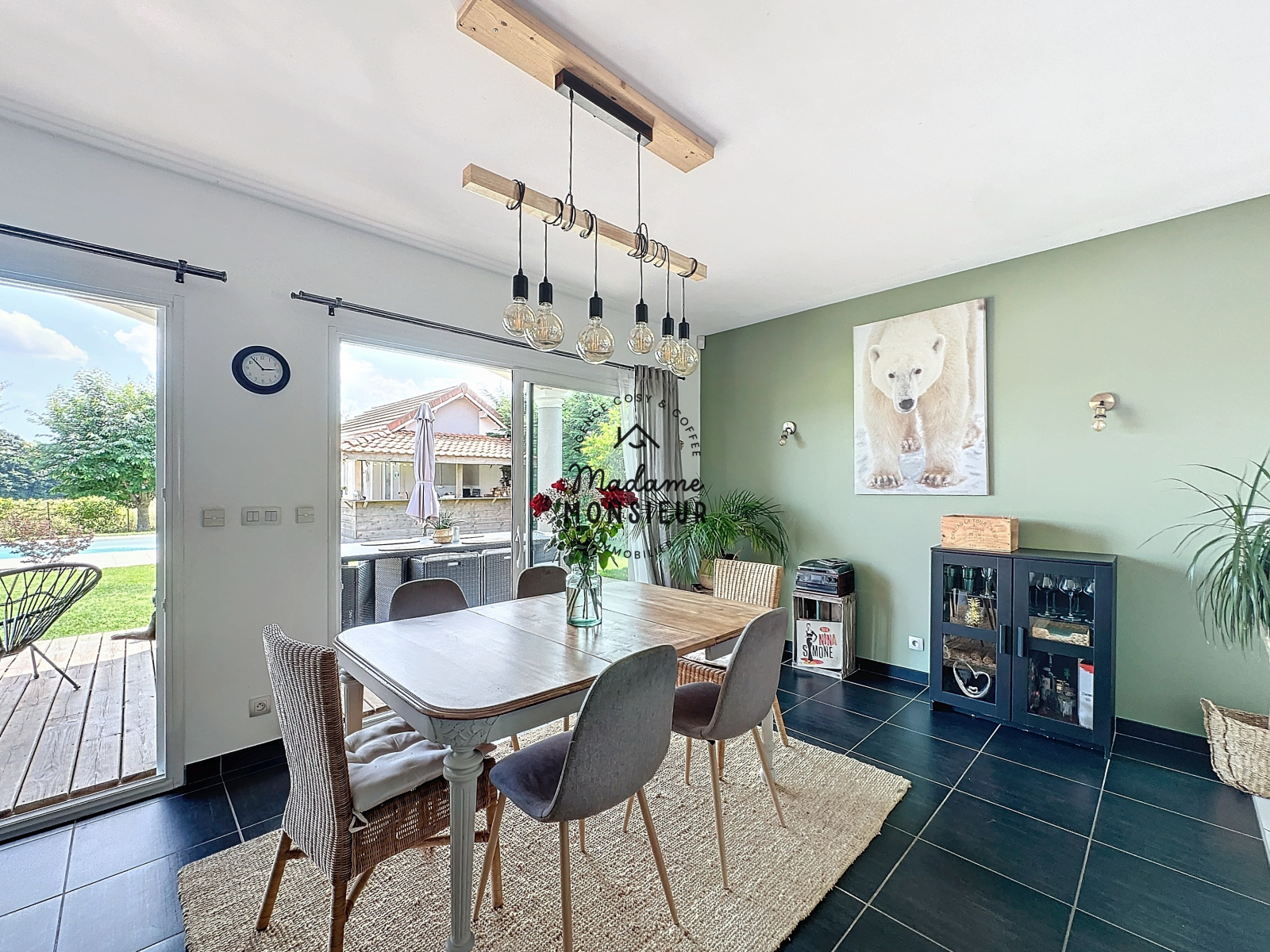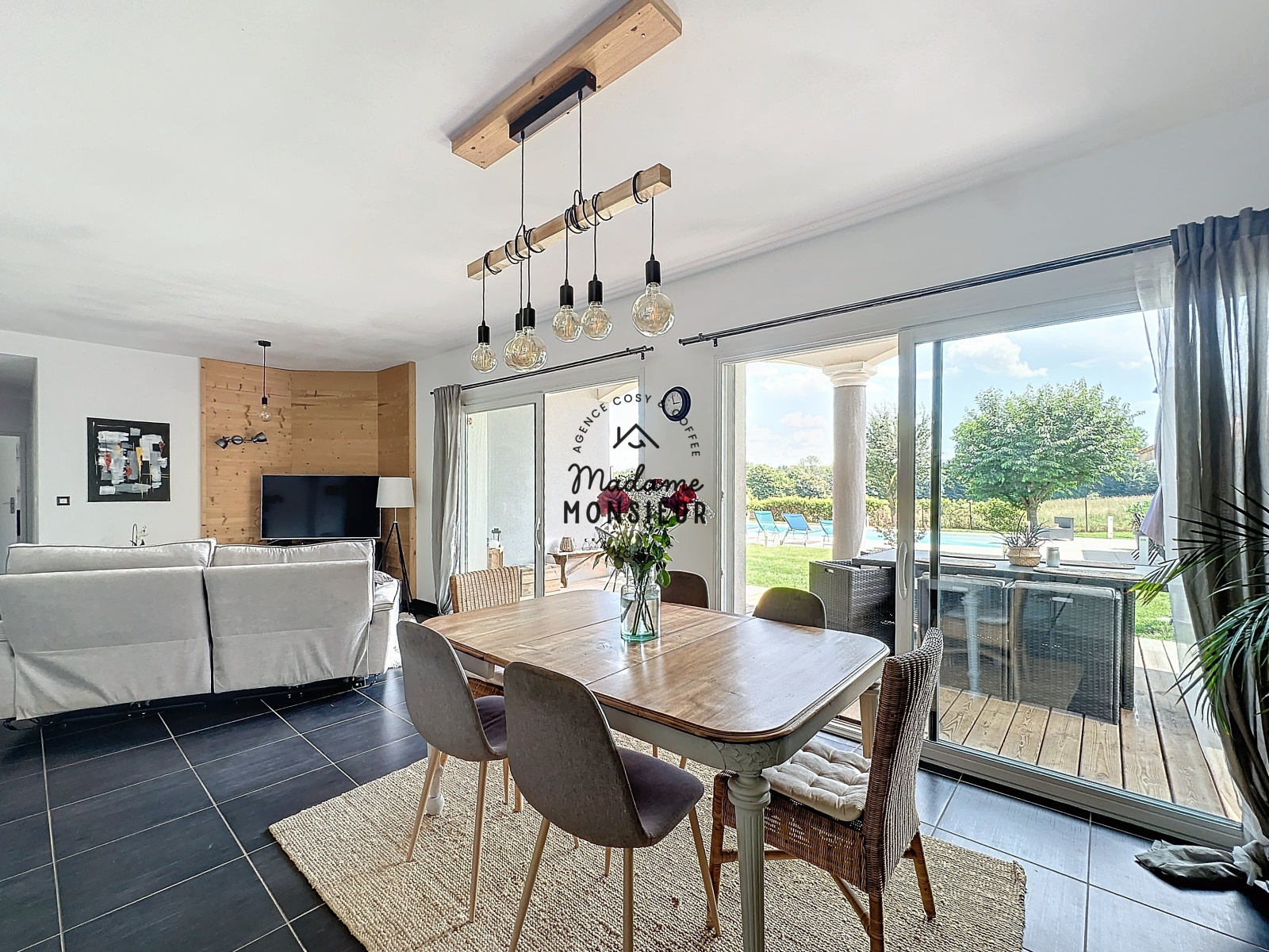 Exclusivité " MADAME MONSIEUR IMMOBILIER" Nous vous proposons cette magnifique maison de plain pied, située dans un cadre très calme, avec une vue imprenable sur les champs agricoles et les montagnes en toile de fond. Exposée plein sud, cette maison bénéficie d’un ensoleillement optimal et d’un environnement idyllique où il n’est pas rare d’apercevoir des biches dans le champ en face. Construite en 2008, la maison a été entretenue avec beaucoup de goût et de soin, par les propriétaires actuels. Elle offre de beaux espaces de vie, dont une grande pièce vitrée donnant sur une terrasse couverte qui surplombe le jardin et la piscineLe jardin comprend un pool house et une dépendance équipée d’un WC, d’une douche et d’un espace d’eau. Une piscine incroyable ajoute une touche supplémentaire de luxe à ce cadre parfait! La maison, d’une superficie habitable de 150 m², dispose également d’un cellier et d’une buanderie. La salle de bain est équipée à la fois d’une douche et d’une baignoire, offrant tout le confort nécessaire. Aucun travaux n'est à prévoir. Le double garage dispose d’un logement indépendant à l’étage, idéal pour des adolescents, recevoir de la famille ou amis, pour de la la location ou pour une profession indépendante. La parcelle, entièrement plate, s’étend sur 1300 m². Située à seulement 700 mètres du village, la maison est également à moins de 10 minutes de l’autoroute et de la gare de La Tour-du-Pin, offrant un accès facile aux commodités et aux transports. N’hésitez pas à me contacter pour plus d’informations ou pour organiser une visite. Lindsay RABATEL au 0611586280