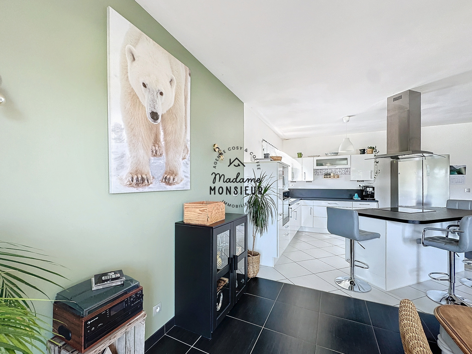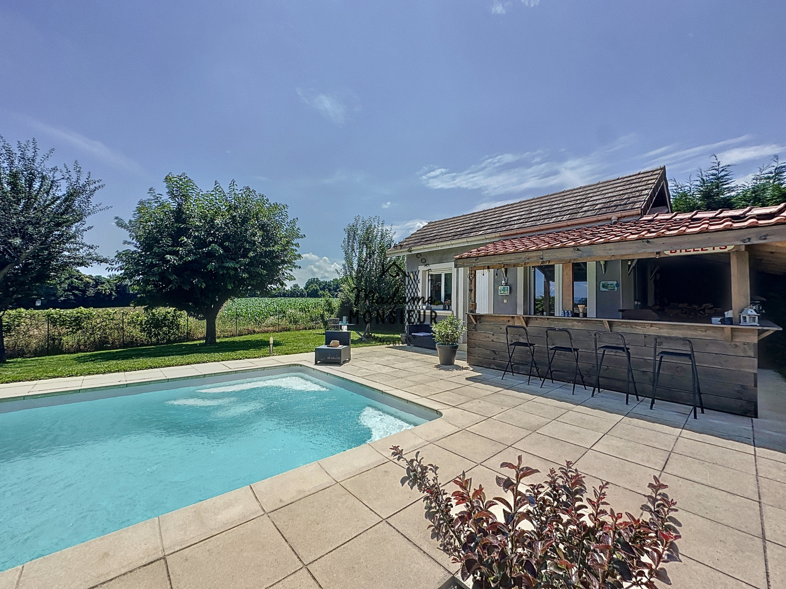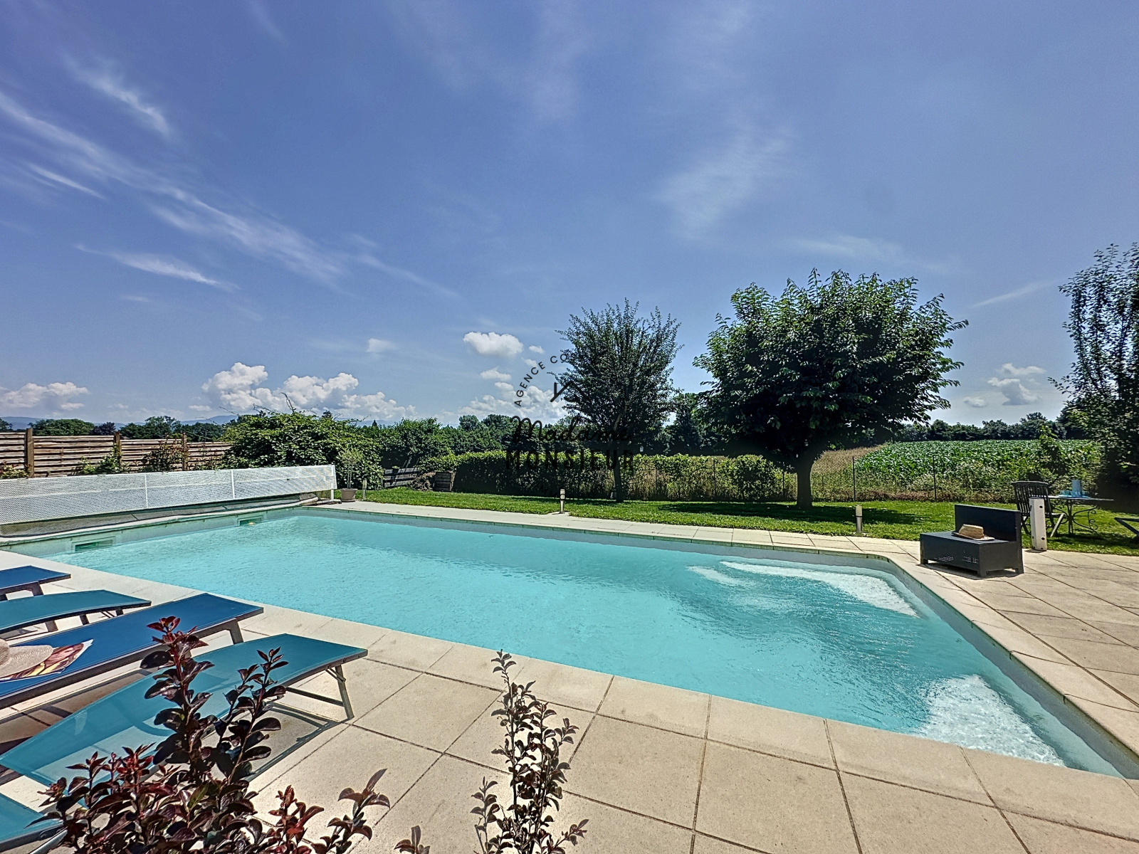 Exclusivité " MADAME MONSIEUR IMMOBILIER" Nous vous proposons cette magnifique maison de plain pied, située dans un cadre très calme, avec une vue imprenable sur les champs agricoles et les montagnes en toile de fond. Exposée plein sud, cette maison bénéficie d’un ensoleillement optimal et d’un environnement idyllique où il n’est pas rare d’apercevoir des biches dans le champ en face. Construite en 2008, la maison a été entretenue avec beaucoup de goût et de soin, par les propriétaires actuels. Elle offre de beaux espaces de vie, dont une grande pièce vitrée donnant sur une terrasse couverte qui surplombe le jardin et la piscineLe jardin comprend un pool house et une dépendance équipée d’un WC, d’une douche et d’un espace d’eau. Une piscine incroyable ajoute une touche supplémentaire de luxe à ce cadre parfait! La maison, d’une superficie habitable de 150 m², dispose également d’un cellier et d’une buanderie. La salle de bain est équipée à la fois d’une douche et d’une baignoire, offrant tout le confort nécessaire. Aucun travaux n'est à prévoir. Le double garage dispose d’un logement indépendant à l’étage, idéal pour des adolescents, recevoir de la famille ou amis, pour de la la location ou pour une profession indépendante. La parcelle, entièrement plate, s’étend sur 1300 m². Située à seulement 700 mètres du village, la maison est également à moins de 10 minutes de l’autoroute et de la gare de La Tour-du-Pin, offrant un accès facile aux commodités et aux transports. N’hésitez pas à me contacter pour plus d’informations ou pour organiser une visite. Lindsay RABATEL au 0611586280