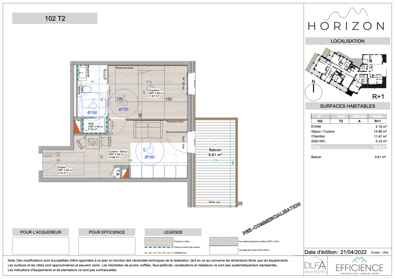 Cet appartement T2 (1 chambre + salon séjour) de 36,22 m ² bénéfici d'un beau balcon vue La Toussuire/Est de 9,81 m ².