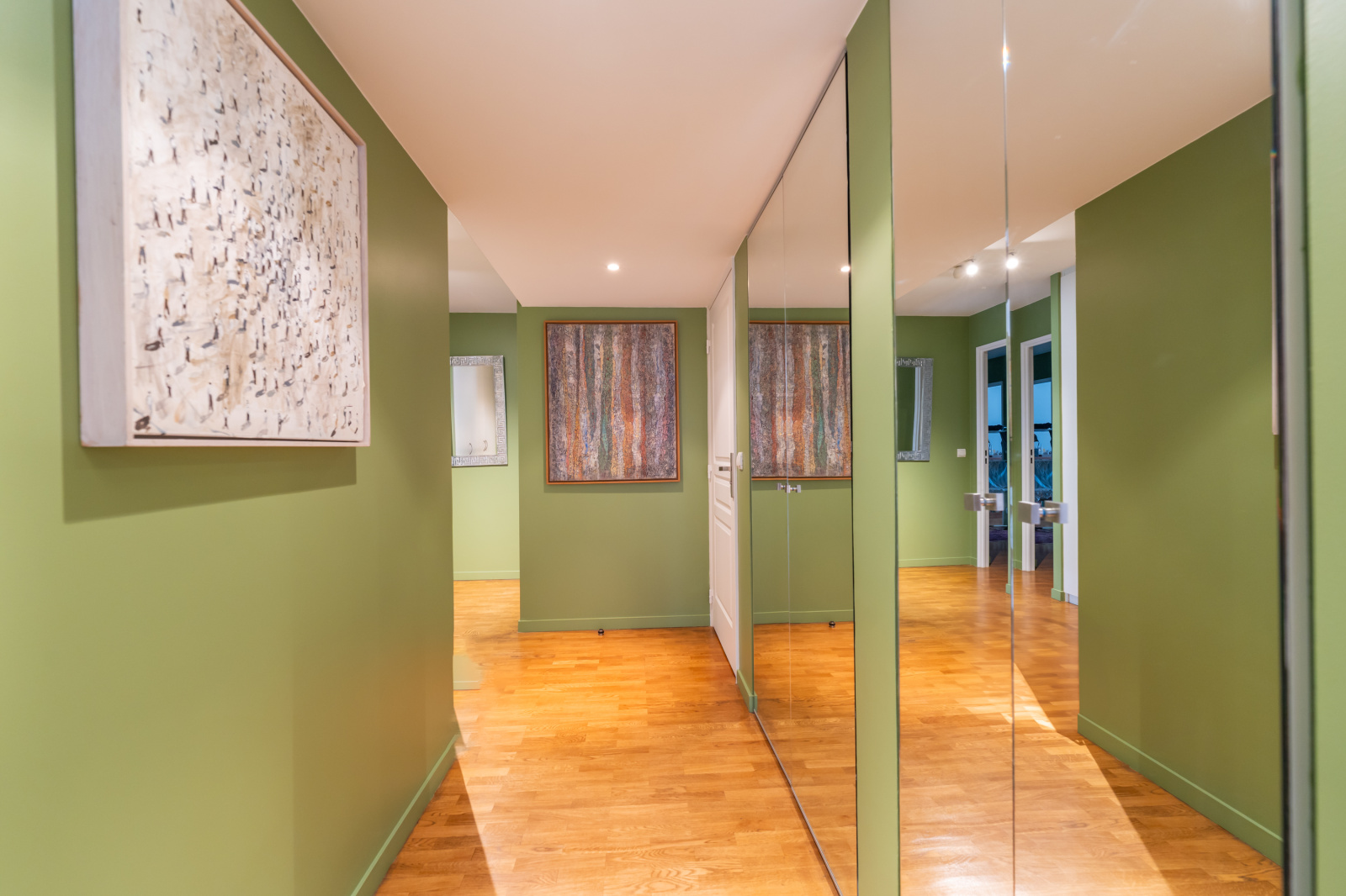 Il se compose d'une grande entrée avec placard sur mesure et toilettes séparées, suivie d'un double séjour / salle à manger de 50m2 prolongeant sur sa terrasse et sa cuisine équipée.